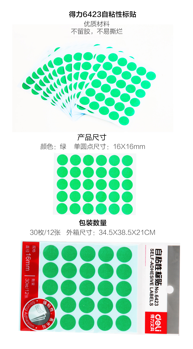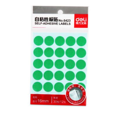 得力自粘性標簽6423 不干膠指示標貼紙 綠色圓點直徑16mm 30枚/張