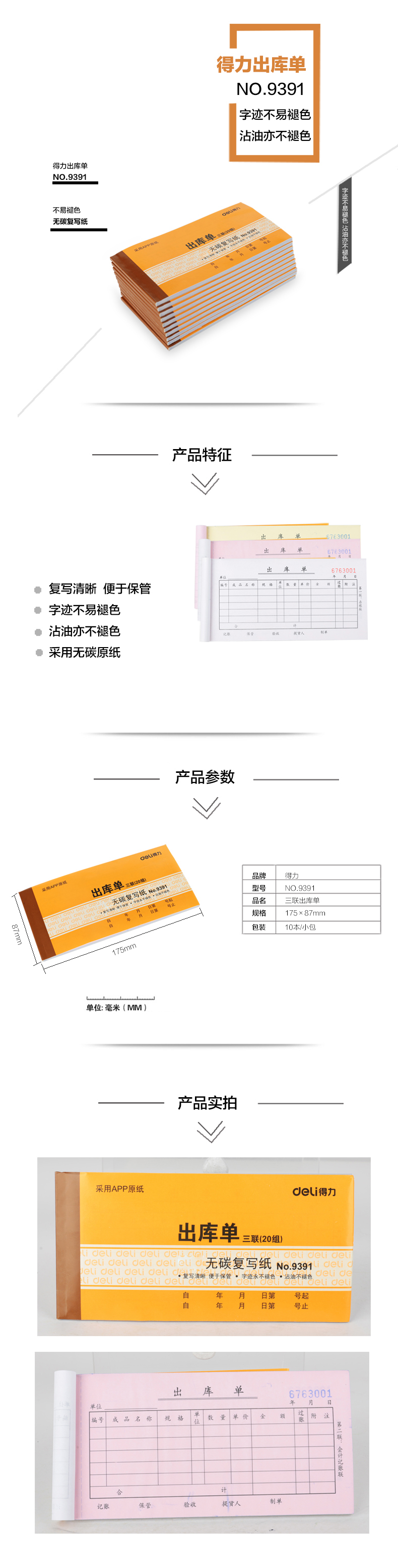 得力三聯出貨出庫單 無碳復寫紙手寫倉庫單據本 9391