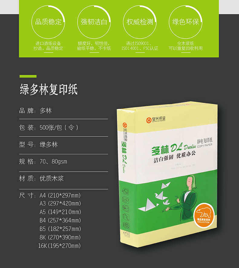 綠多林 A4復印紙 70G 80G 500張/包 5包/箱