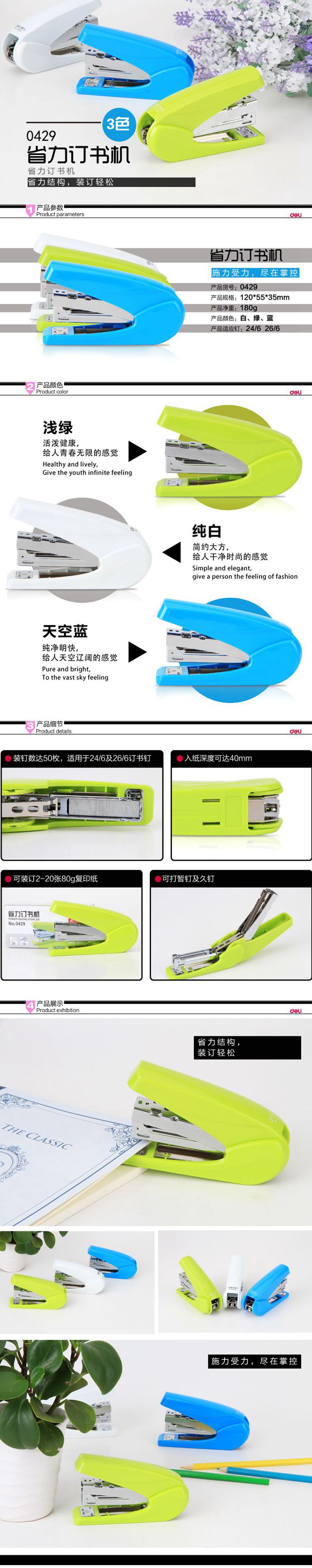 得力0429 省力訂書機 12號針訂書器 炫彩型訂書機可訂20張辦公用品