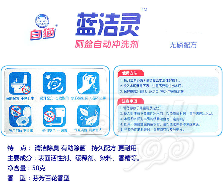 白貓藍(lán)潔靈(百花香型)藍(lán)泡泡廁盆自動(dòng)沖洗劑 潔廁劑 50克