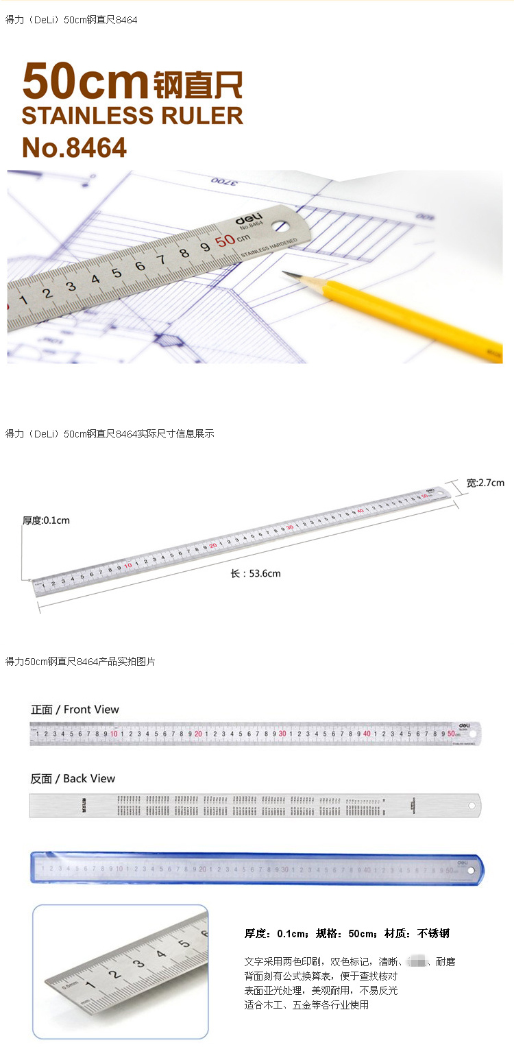 得力8464 50cm鋼尺 50厘米鋼直尺 加厚 不銹鋼尺子 繪圖辦公文具 尺子