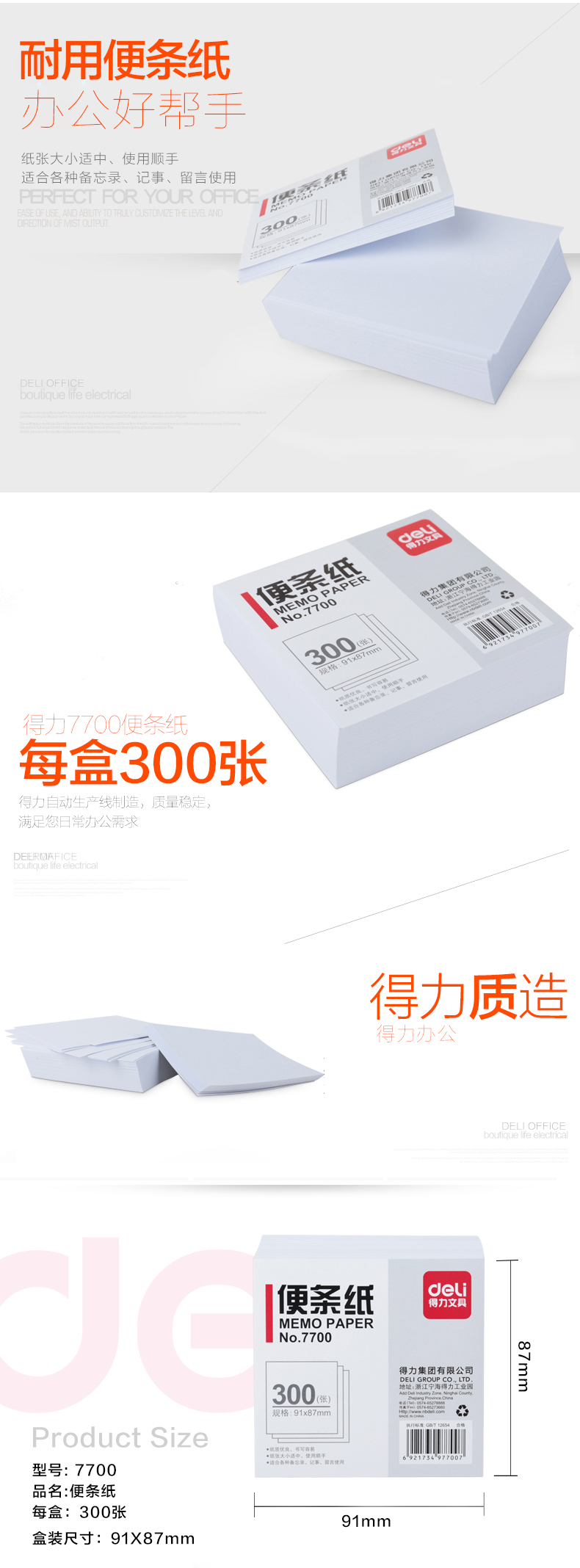 得力7700便條紙便簽紙 留言紙 便利本91×87mm300張 白色