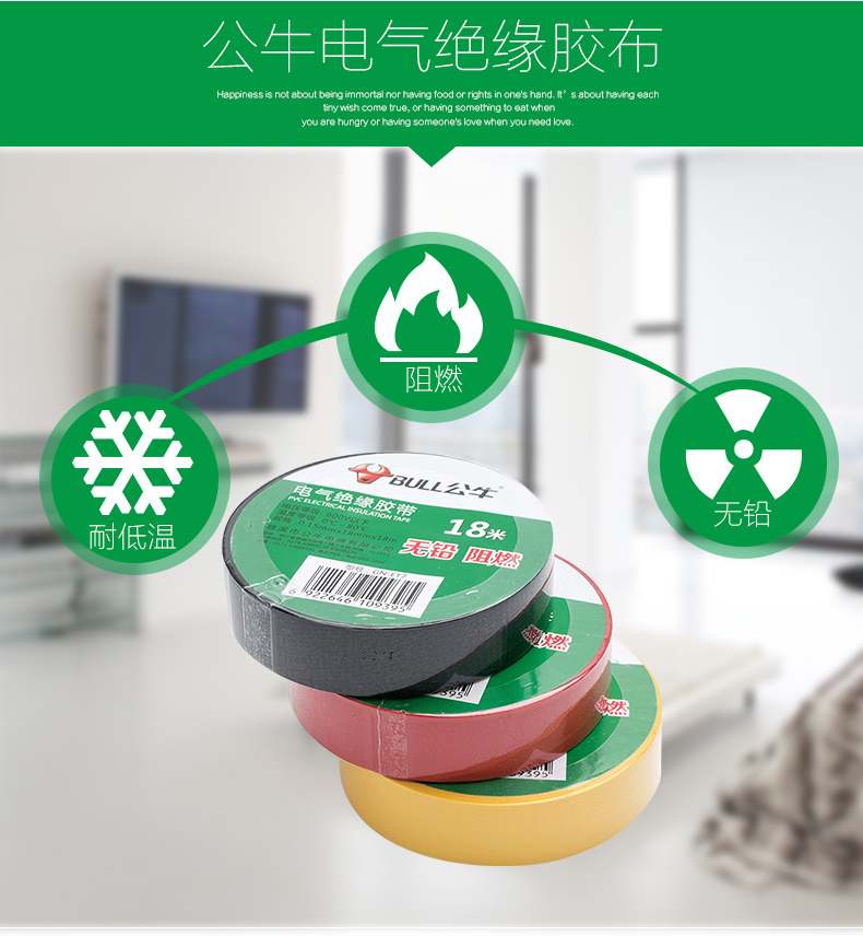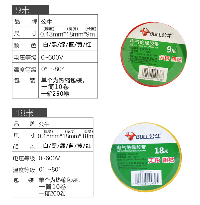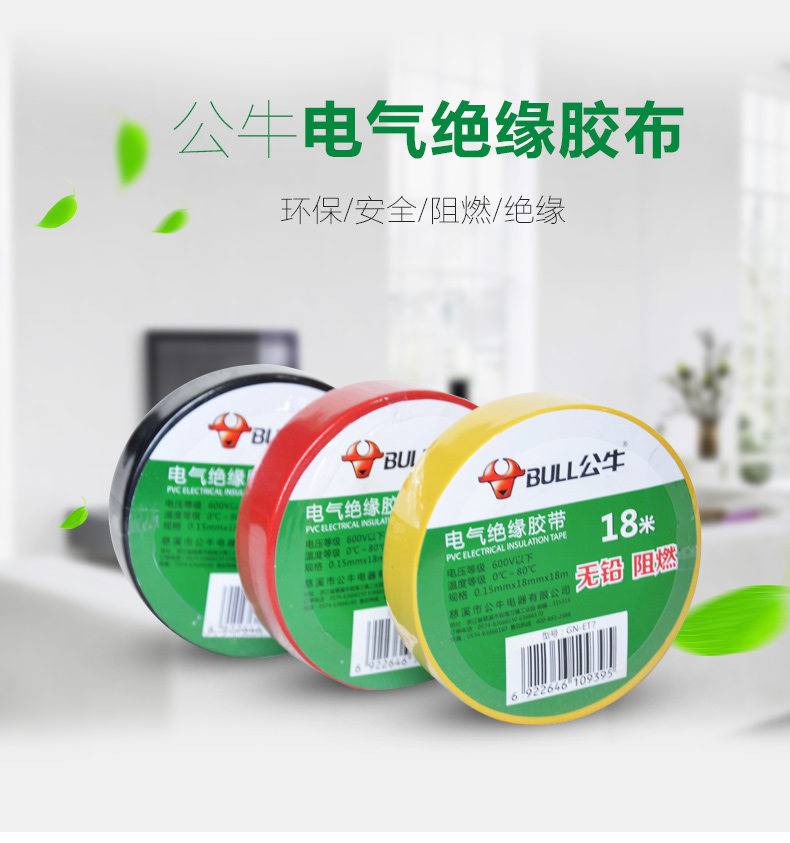 公牛電工膠布耐高溫阻燃電膠布無鉛高壓絕緣黑膠帶大卷18米