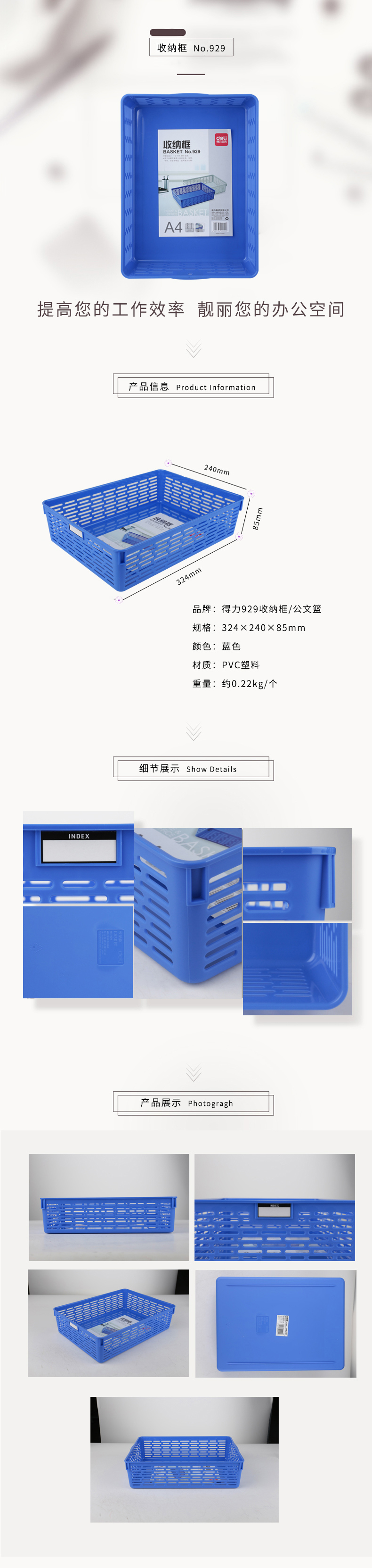得力929 公文籃 文件框文件籃資料收納盒文件筐檔案收納辦公用品網狀公文籃 929收納框(無蓋藍色)