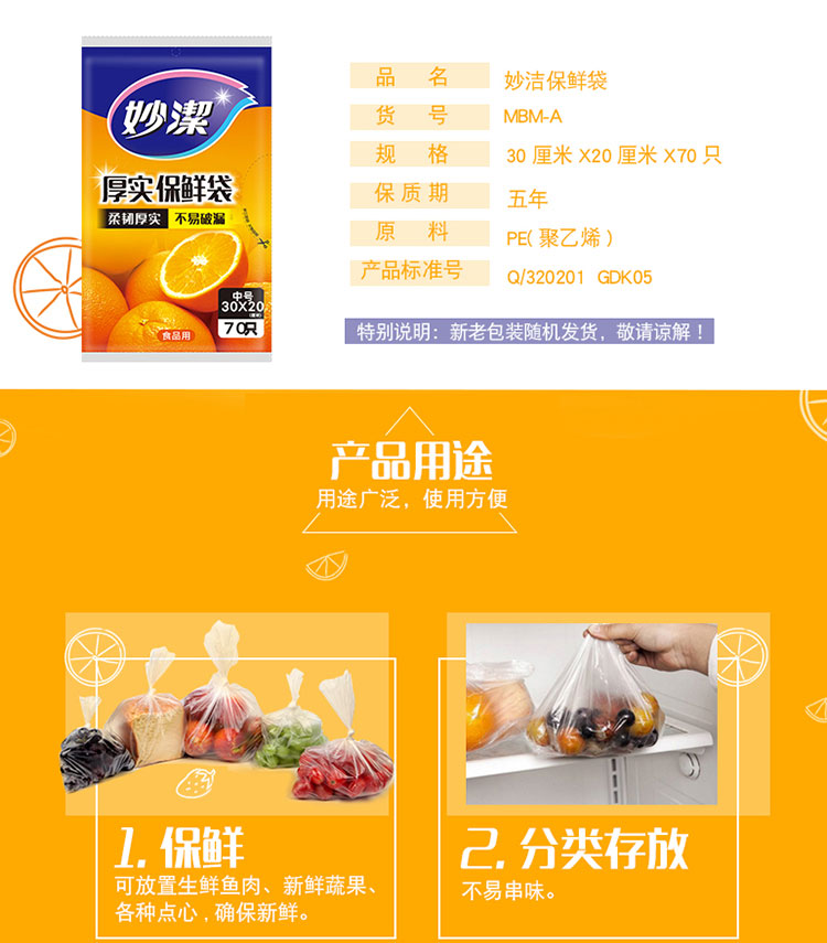 妙潔 中號保鮮袋 70只裝 20cm*30cm 一次性保鮮袋 抽取式 食品袋