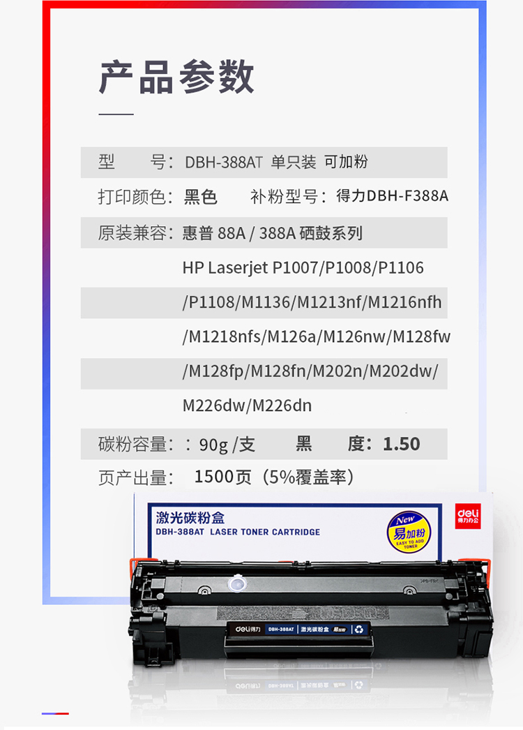 得力(deli)DBH-388AT易加粉硒鼓 88A打印機硒鼓(適用惠普 P1007/P1008/P1106/P1108/M1136/M1213nf/M1216nfh)dyhc