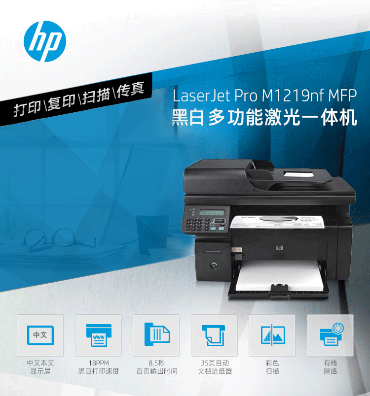 惠普(HP)LaserJet Pro M1219nf 多功能激光一體機 (打印 復印 掃描 傳真) 打印機
