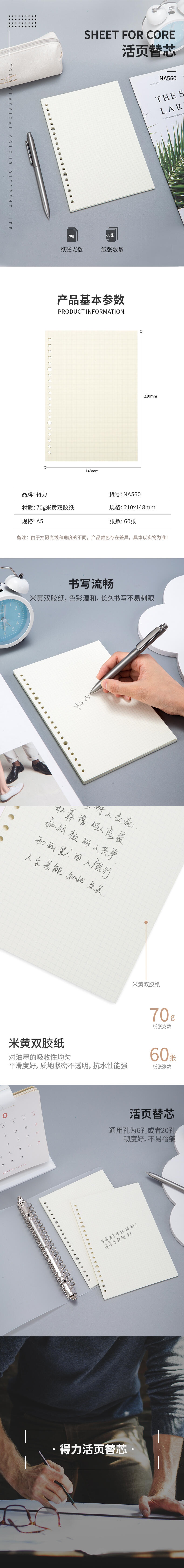 得力(deli)A5/60張活頁筆記本替芯 20孔方格款替芯 NA560
