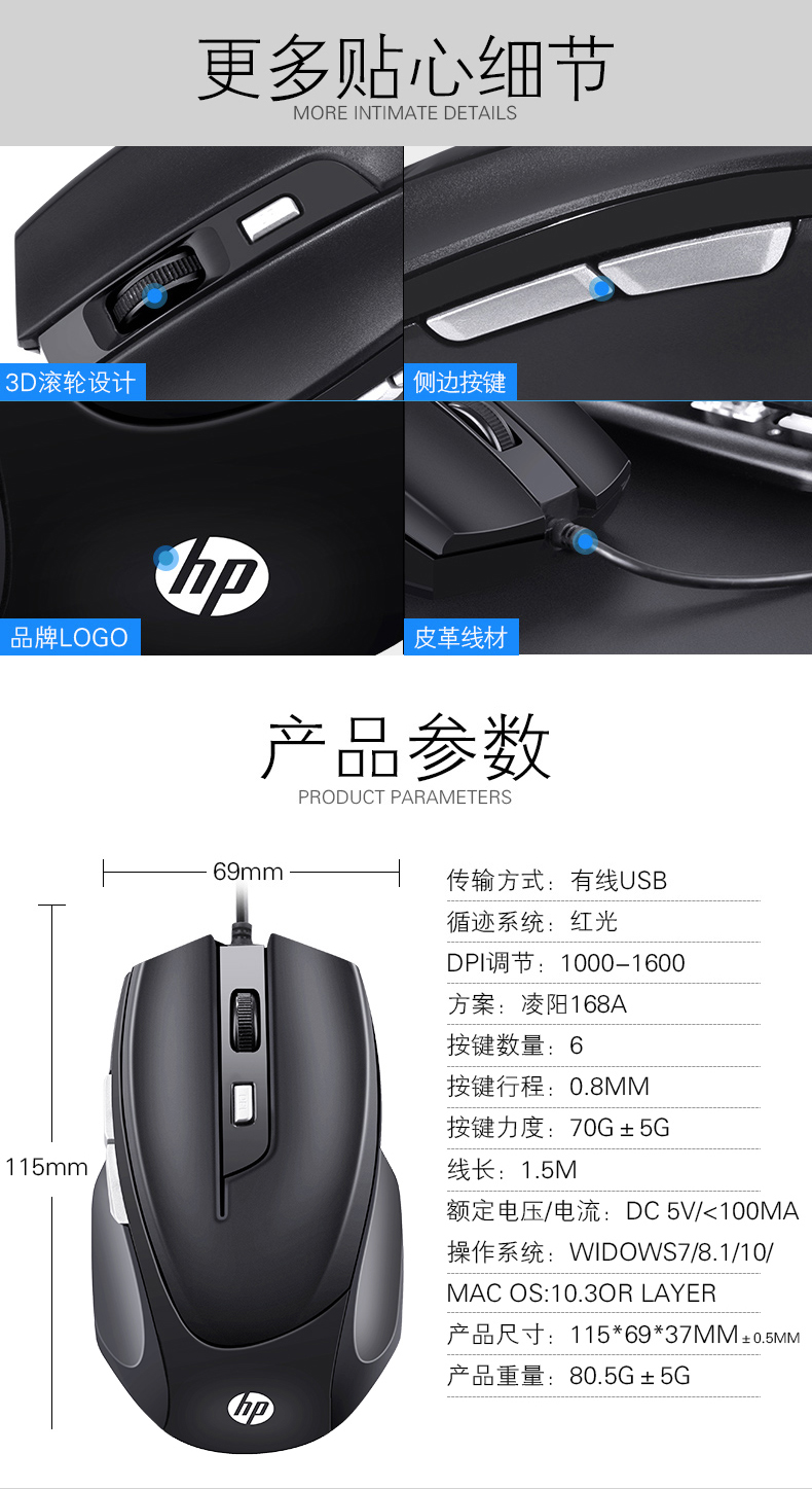 惠普(HP)M150 有線游戲鼠標 (筆記本辦公鼠標 電腦家用鼠標) 黑色