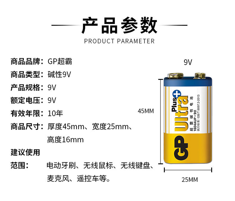超霸(GP) 9V 電池 GP1604A-L1堿性電池