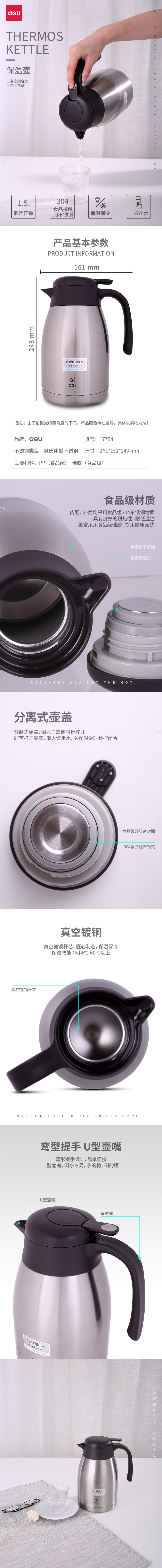 得力17754 17755保溫壺(本色)1.5l不銹鋼真空保溫 保溫杯 開水壺