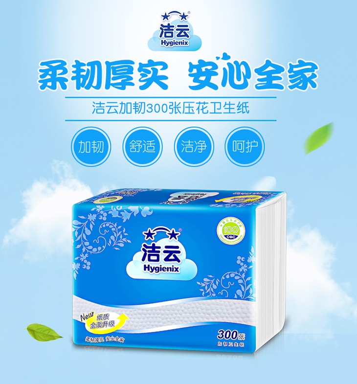 潔云(Hygienix) 10240101加韌壓花衛生紙-300張(促銷裝) 平板紙