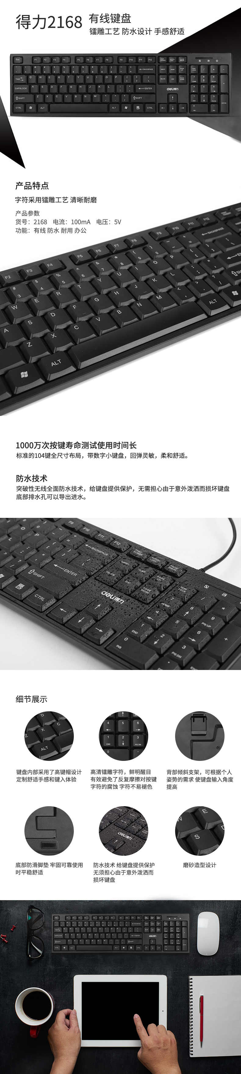 得力(deli) 高鍵帽鍵盤 游戲鍵盤 防水薄款 2168黑色