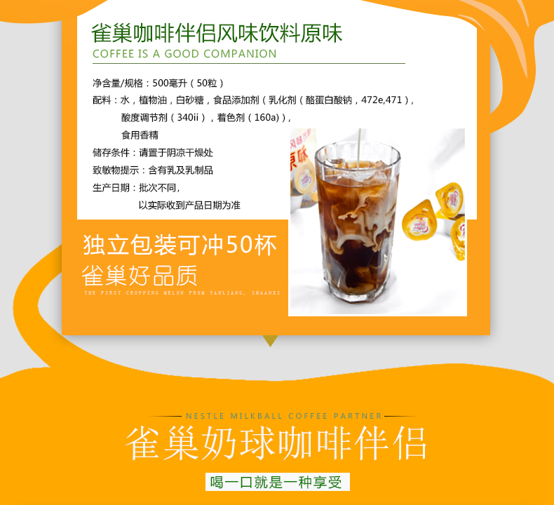 雀巢咖啡伴侶奶原味奶球10ml*50粒奶油球植脂奶精球糖包奶包500ml