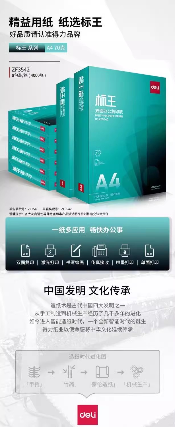 得力a4/70g每包500張綠標王打印復印紙雙面辦公大容量打印紙A4 打印紙 復印紙fyz