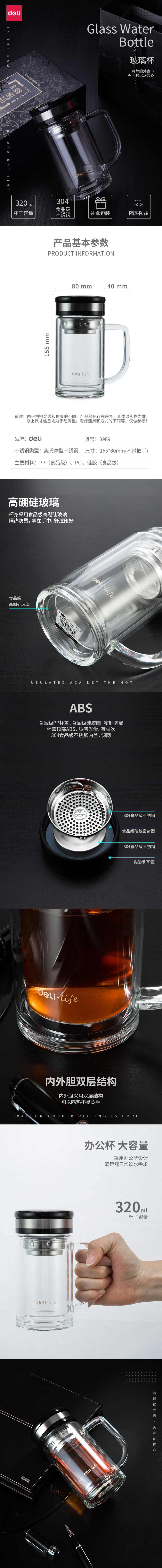 得力8989玻璃杯(透明)(只)320ml 水杯 杯子