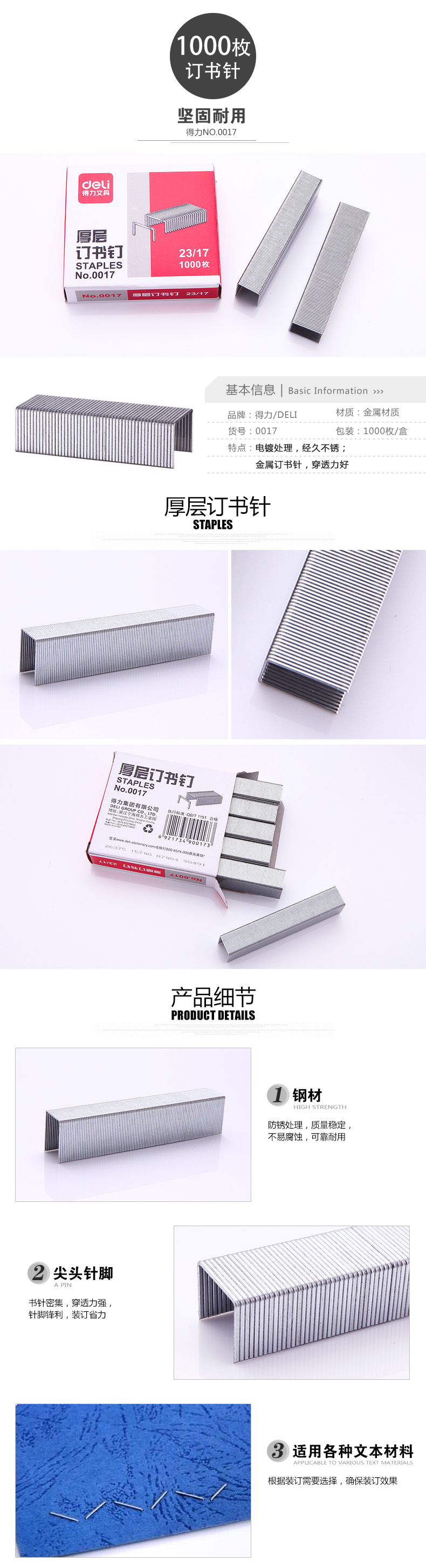 得力0017厚層訂書釘加厚大號訂書針23/17 裝訂頁數120頁 得力0017訂書針