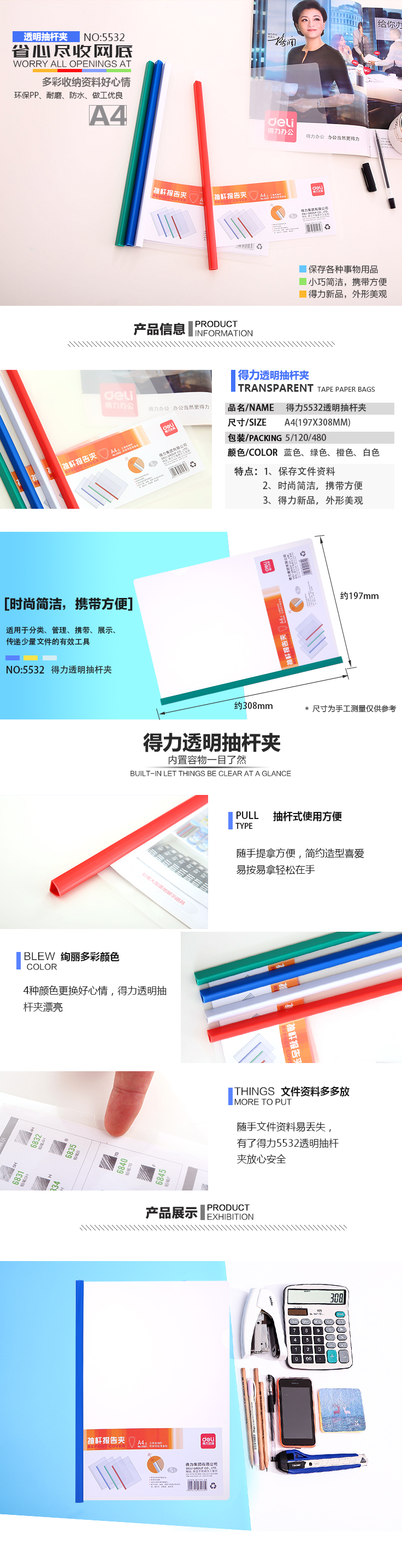 得力抽桿夾5532厚度15mm拉桿夾 可夾80頁 三角彩色桿資料夾 辦公用品批發