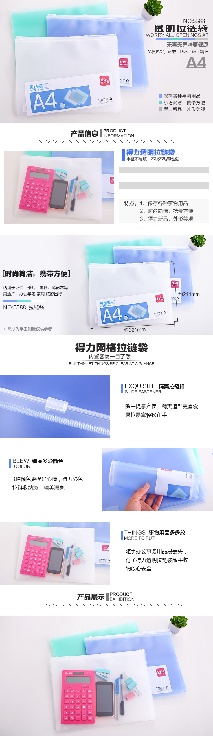 得力5588/5589 拉邊袋拉鏈袋資料袋 A4/a5文件袋子PP磨砂 整理夾 磨砂文件袋