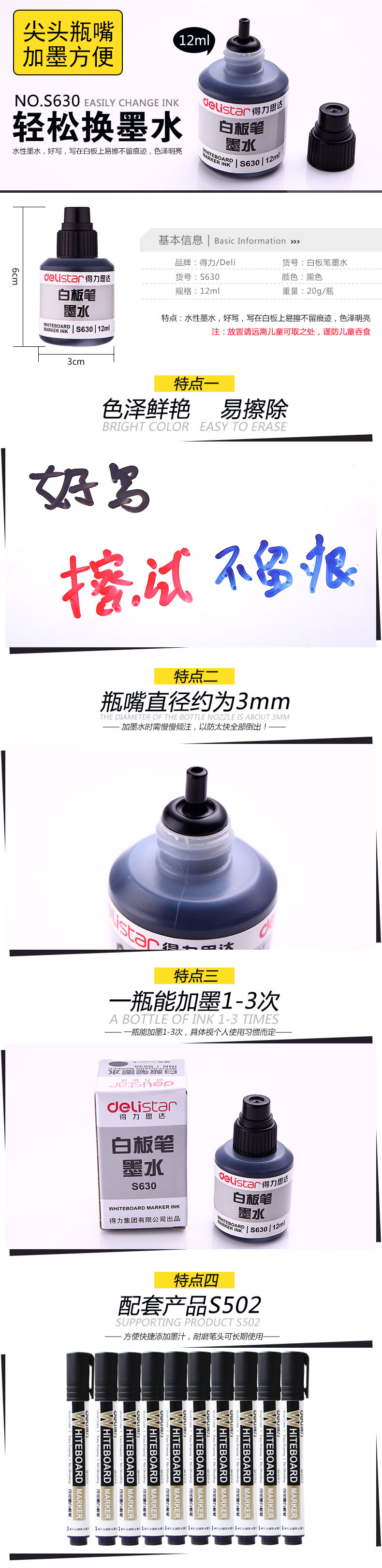 得力S630白板筆墨水 白板筆專用補充液 白板筆水12ml
