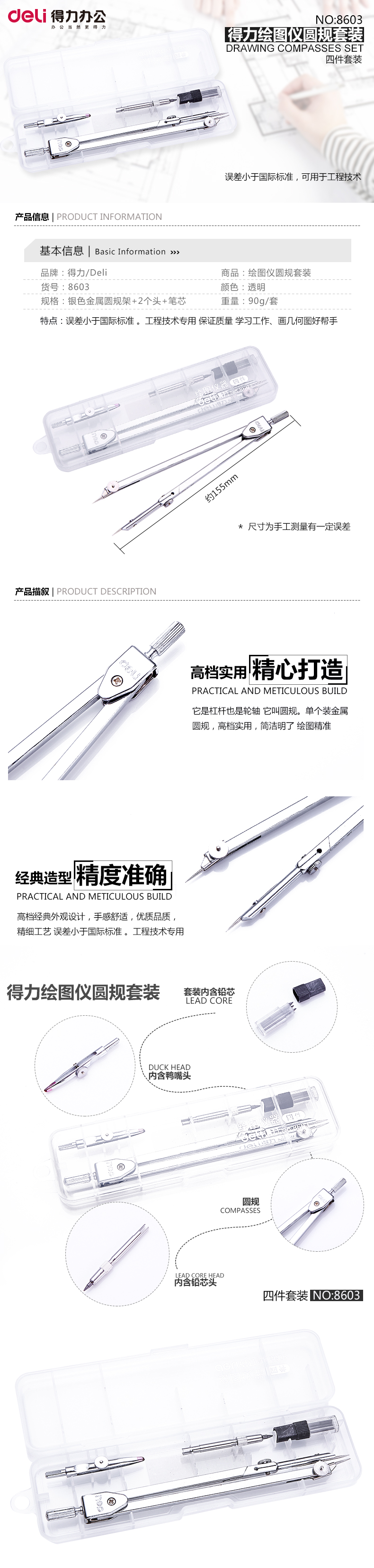 得力(deli)8603 金屬繪圖圓規套裝(圓規 鴨嘴頭 鉛芯頭 鉛芯)