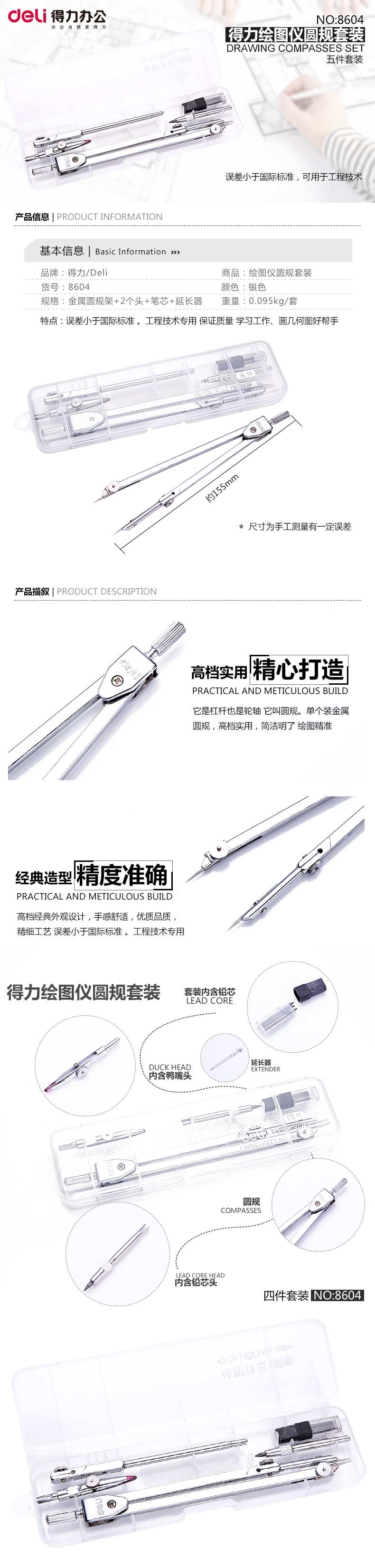 得力(deli)8604 金屬繪圖圓規套裝(圓規 延長桿 鴨嘴頭 鉛芯頭 鉛芯)