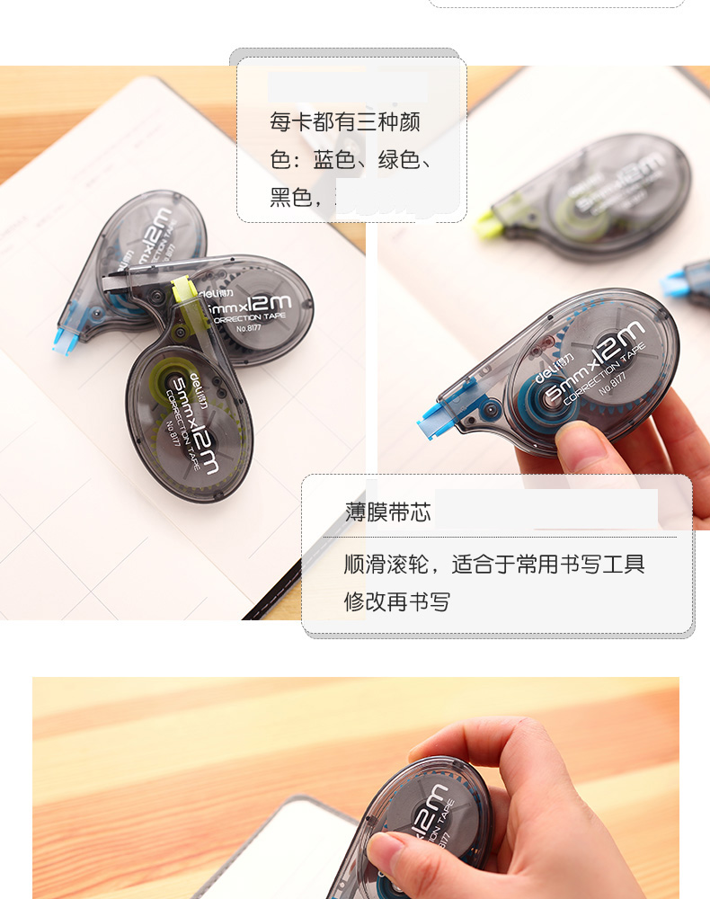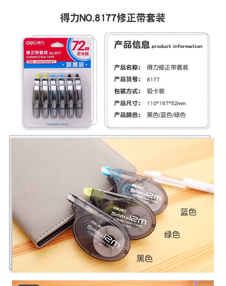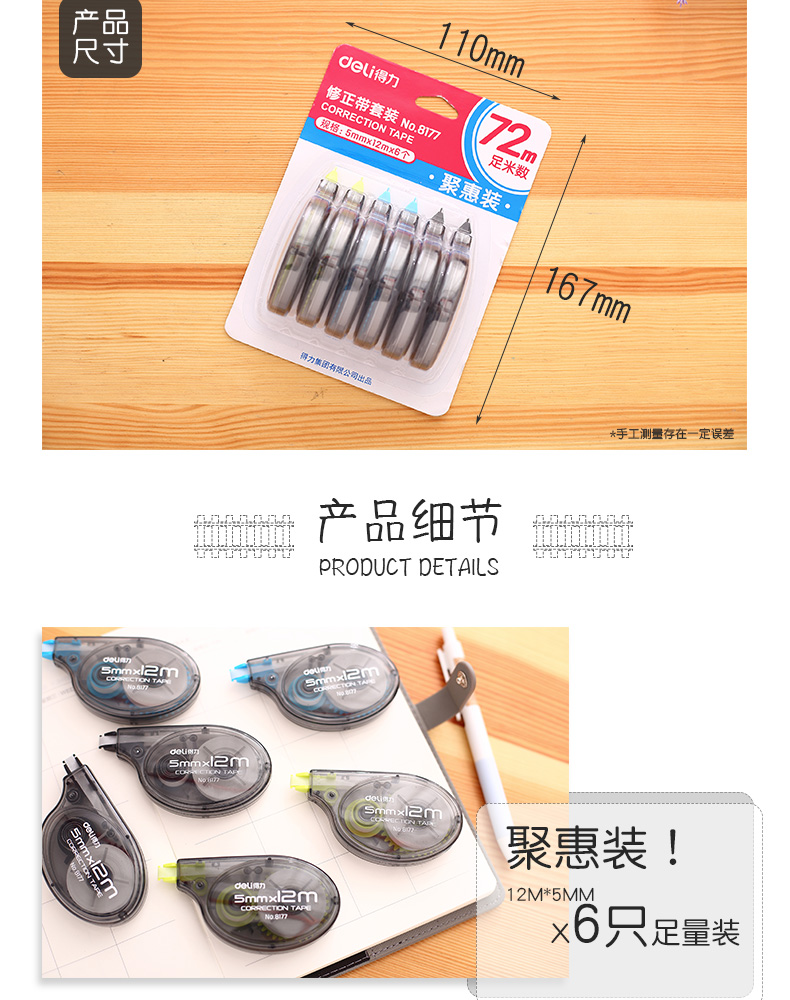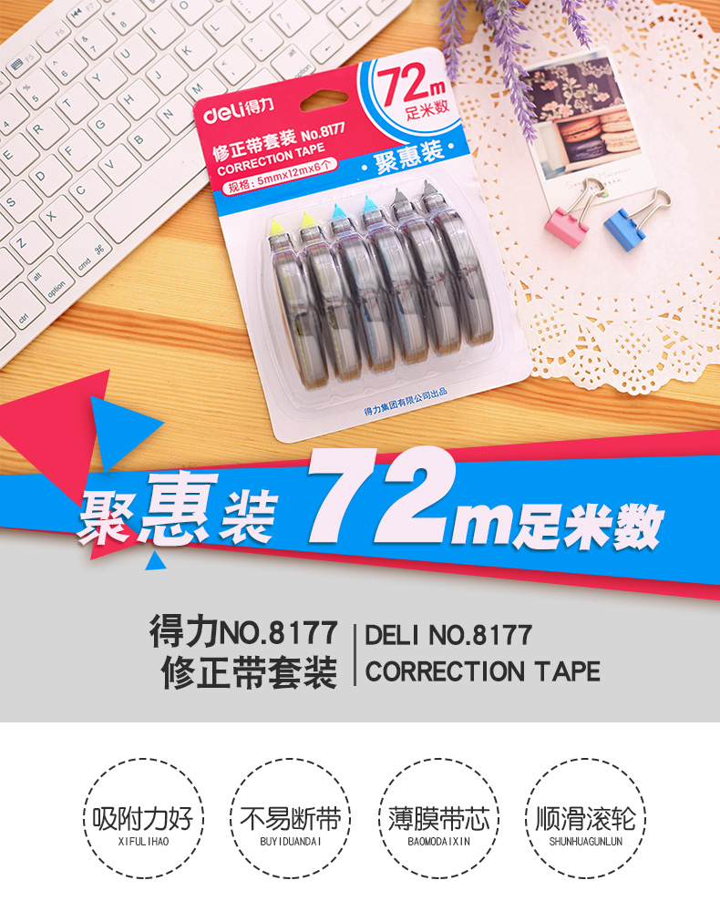 得力(deli) 8177修正帶套裝改正帶6個裝72米學生修正帶得力涂改帶包郵聚惠裝 8177 6個裝72米 開學
