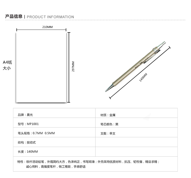 晨光(M&G) 文具自動鉛筆0.5全金屬鉛筆MP1001活動鉛筆0.7鉛筆 辦公用品 一支 全金屬MP1001 0.7mm 開學