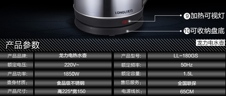 龍力 LL-180GS自動斷電不銹鋼電熱水壺燒水壺防干燒1.8升大容量